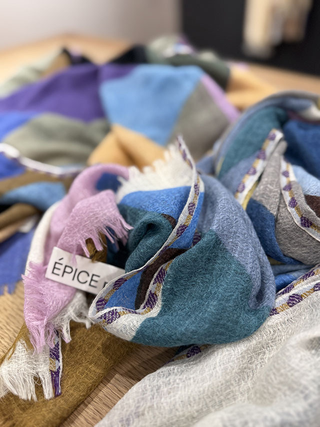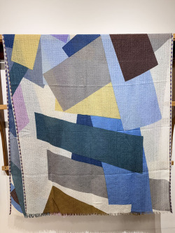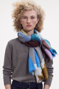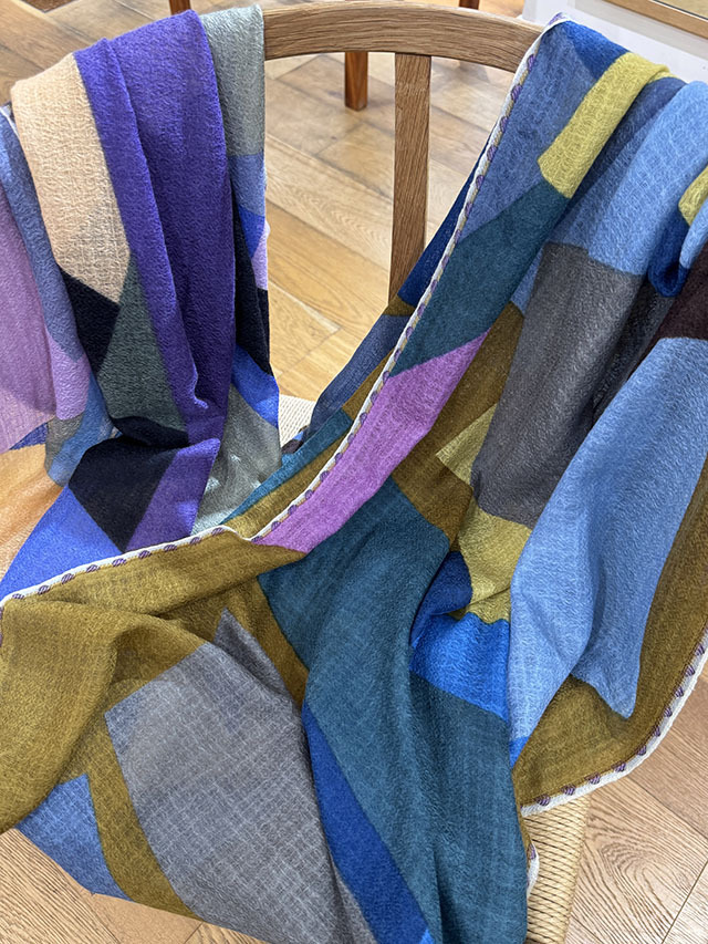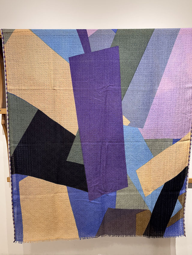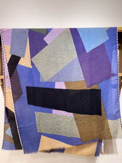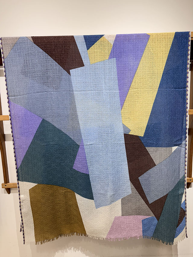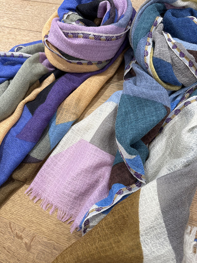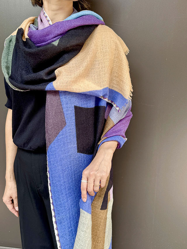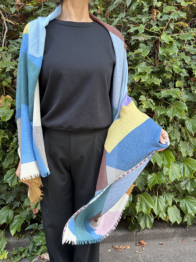 幾何学がモダンな今季の《グラフィック柄》。お祝いの風景の≪コンフェッティシャワー(紙ふぶき)≫にインスパイアされたグラフィック柄は、紙ふぶきの紙片を細い帯状にカットするなど、自由な抽象画にアレンジし、入念に色を組み合わせ、配置したもので、洗練された北欧デザインが際立ちます。素材はカシミヤの艶感やぬめり感など上質な素材感が贅沢に味わえる「カシミヤ・シルク・ウール」の混紡素材。薄手でボリュームが出すぎず、美しいドレープが際立ちます。ロングシーズン使えるワンランク上のストールです。