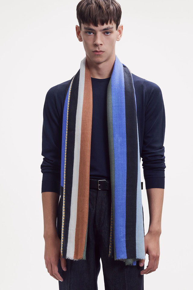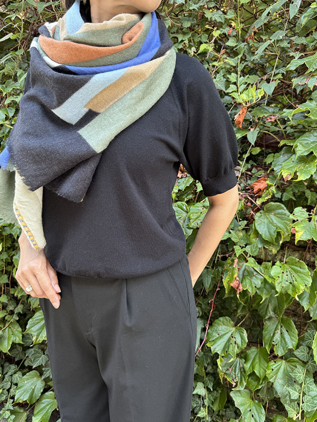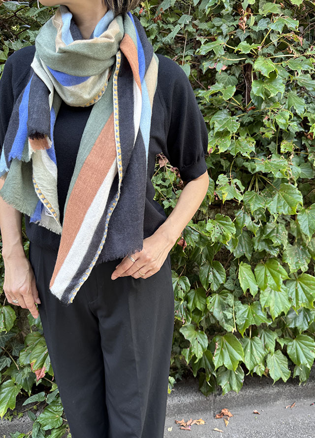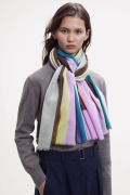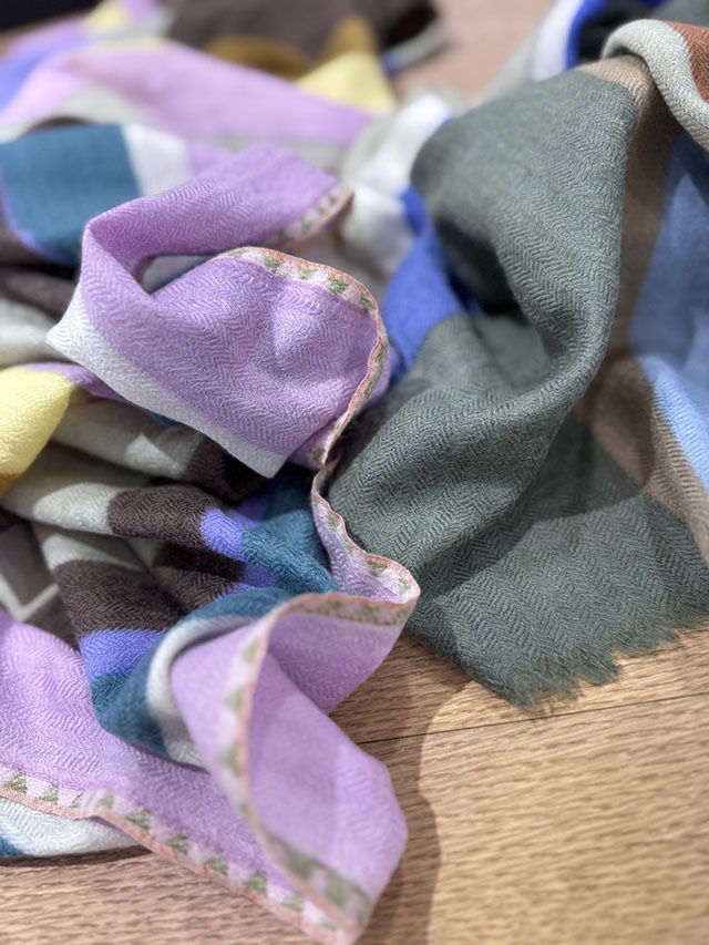 お祝いの風景の≪コンフェッティシャワー(紙ふぶき)≫にインスパイアされたグラフィック柄は、紙ふぶきの紙片を細い帯状にカットするなど、自由な抽象画にアレンジし、入念に色を組み合わせ、配置したもので、洗練された北欧デザインが際立ちます。素材はカシミヤの艶感やぬめり感など、上質な素材感が贅沢に味わえる「カシミヤ・ウール」の混紡素材。カシミヤ配分が多いため、60cm幅でも暖かさは格別、薄手で美しいドレープがでますが、首元にすっきり収まります。