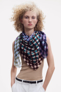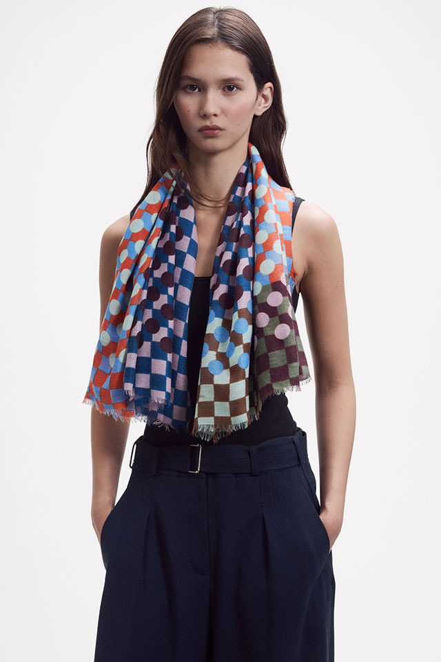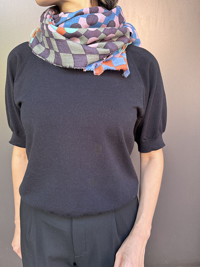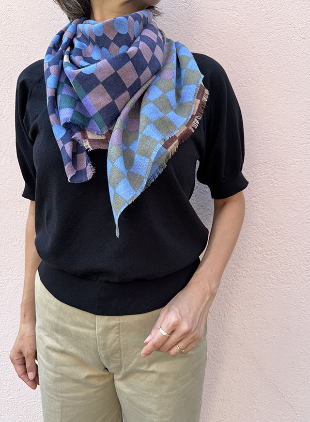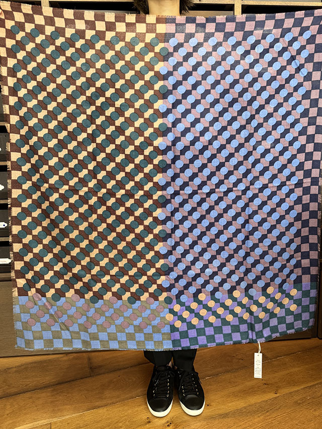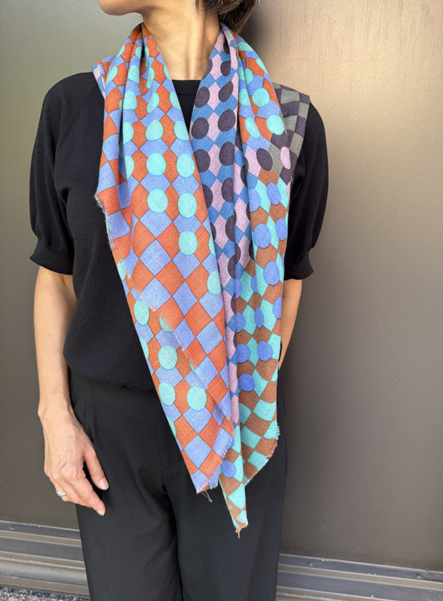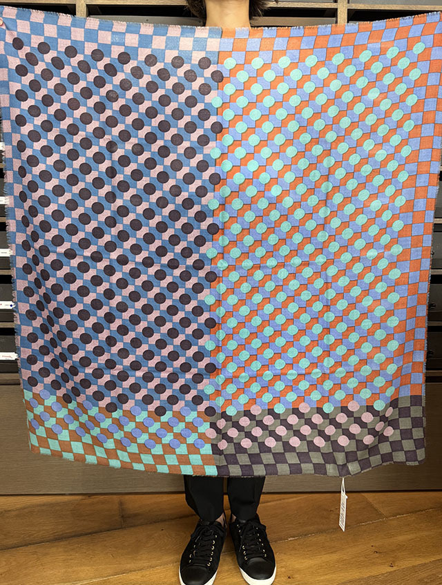 幾何学がモダンな今季の《グラフィック柄》。基本的な幾何学形状である円や四角のシェイプがカットされ、重ねられた《サークル&スクエア》シリーズ。鮮やかな色彩の繊細な視覚効果で、ダイナミックな動きと奥行き感が感じられます。素材はウールにシルクとカシミヤがブレンドされ、しなやかな肌触りと、発色の良い上質感が際立ちます。