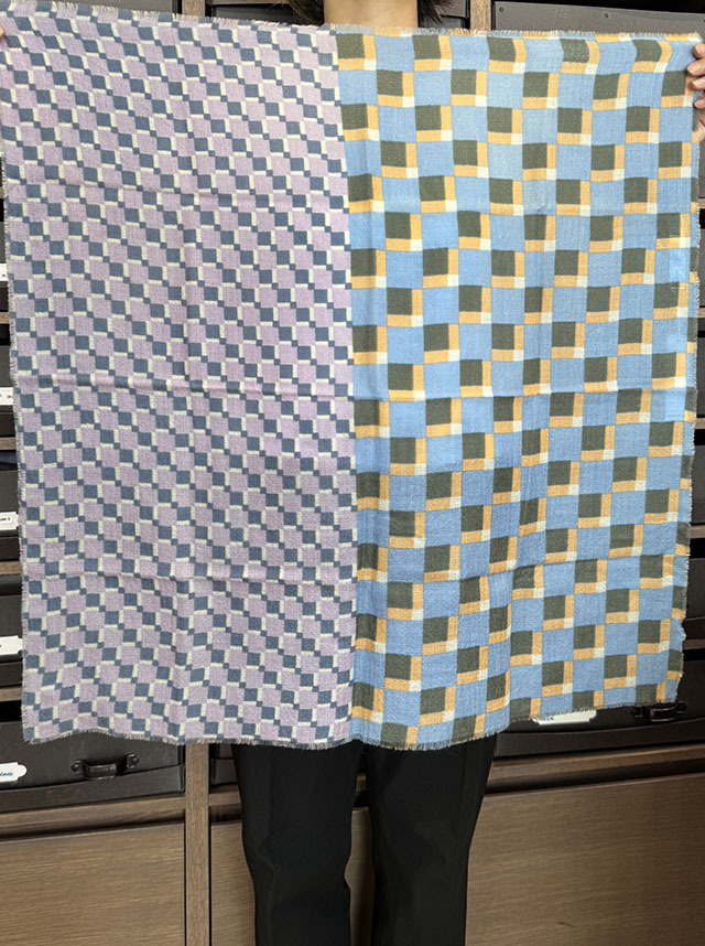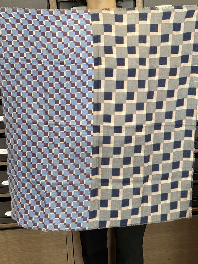 幾何学がモダンな今季の《グラフィック柄》。基本的な幾何学形状である円や四角のシェイプがカットされ、重ねられた《サークル&スクエア》シリーズのこちらは四角の形。鮮やかな色彩の繊細な視覚効果で、ダイナミックな動きと奥行き感が感じられます。素材はカシミヤの艶感やぬめり感など、上質な素材感が贅沢に味わえる「カシミヤ・ウール」の混紡素材。カシミヤ配分が多いため、包まれるような暖かさと柔らかさは格別です。