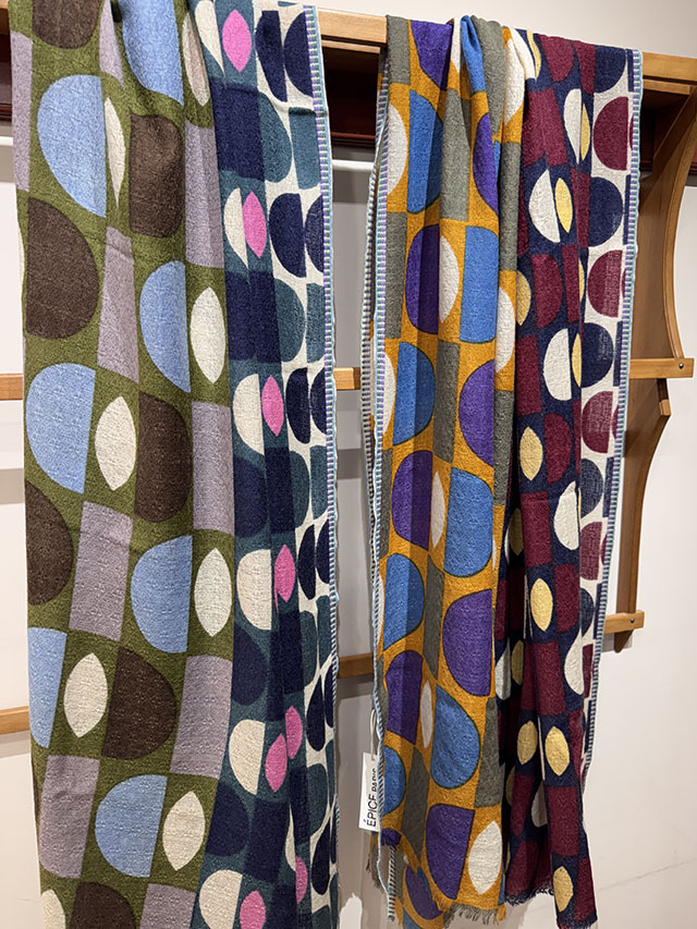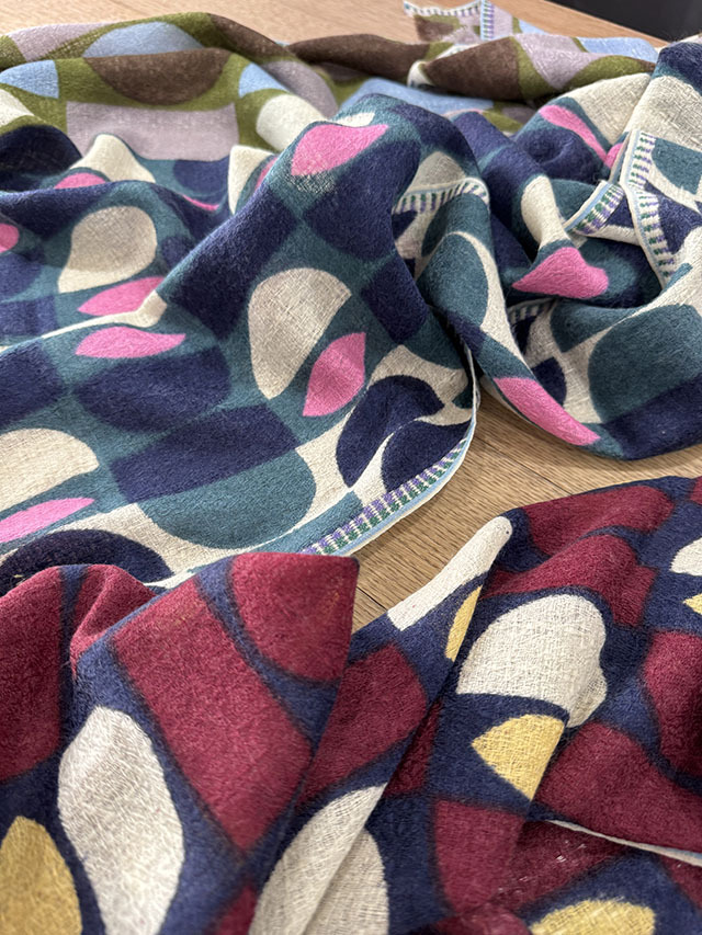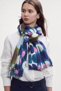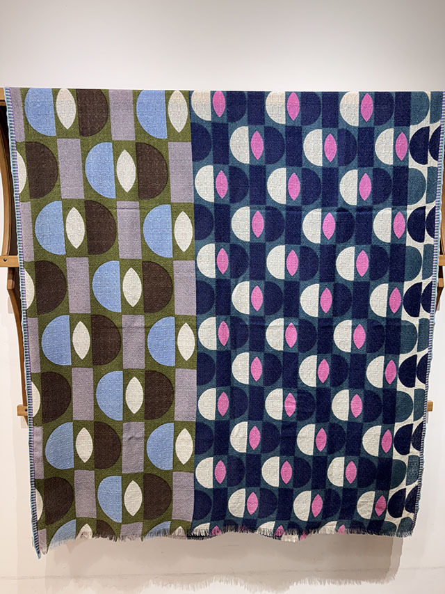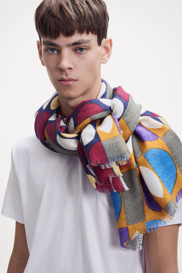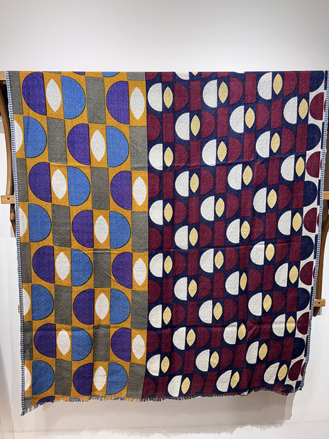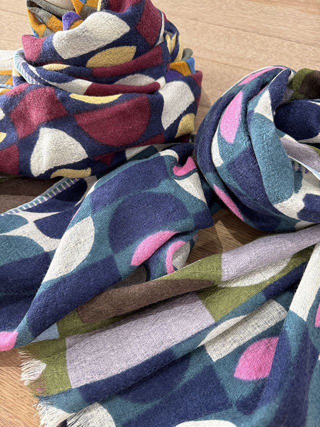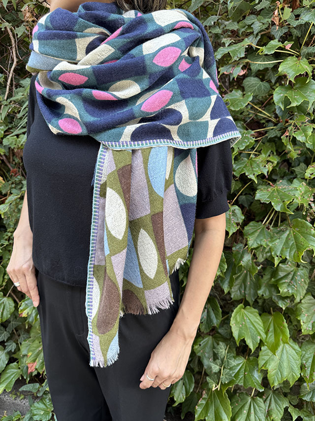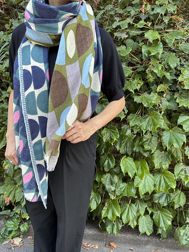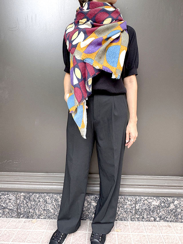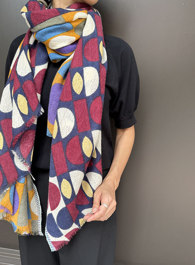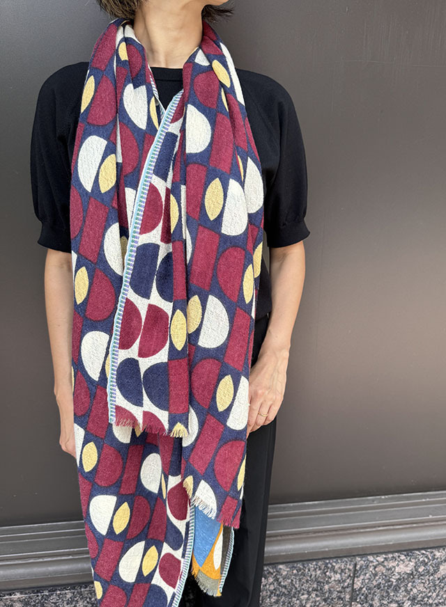 デンマークデザインの巨匠といわれる建築家・デザイナーである「Arne Jacobsen アルネ・ヤコブセン」の1950〜60年代の名作テキスタイルからインスパイアーされた≪デンマークテキスタイル柄≫。円や四角の幾何学形状をカット、リピート、重ね合わせ、回転させたグラフィカルなデザインは鮮やかな色彩やダイナミックなコラージュ技法によって、独特な魅力を放っています。上質なウール素材は薄手でしなやかな肌触り、ボリュームが出すぎず、美しいドレープや落ち感が楽しめます。巻き方次第で異なる印象を、遊び心のある大人の男女におすすめです。