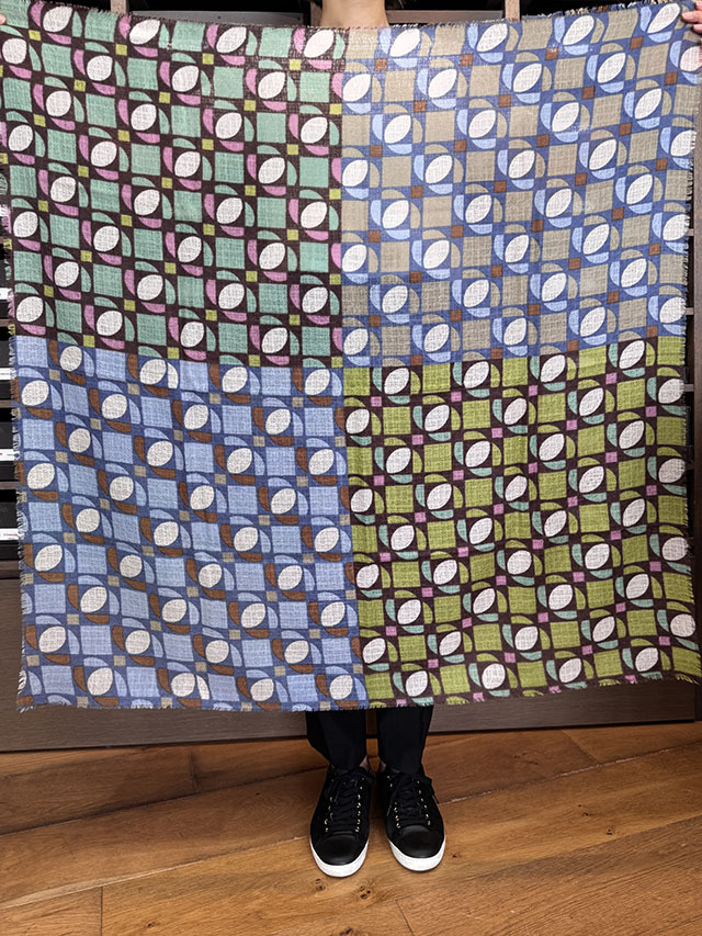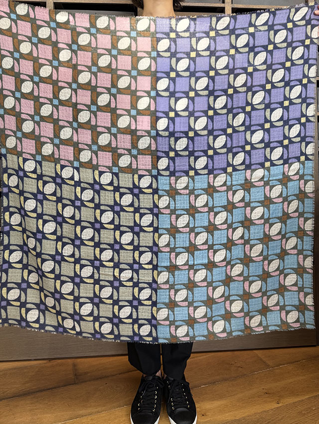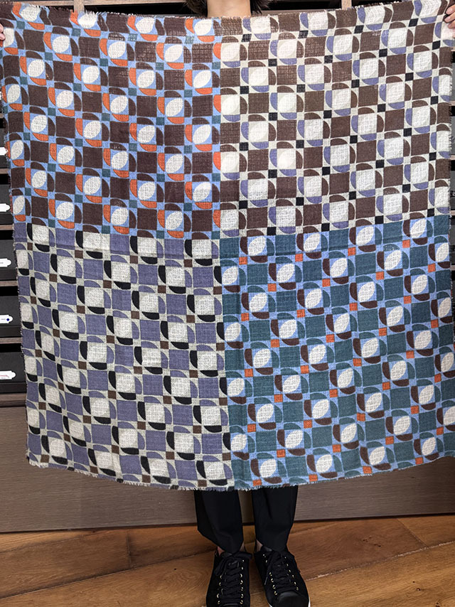 デンマークデザインの巨匠といわれる建築家・デザイナーである「Arne Jacobsen アルネ・ヤコブセン」の1950〜60年代の名作テキスタイルからインスパイアーされた≪デンマークテキスタイル柄≫。円や四角の幾何学形状をカット、リピート、重ね合わせ、回転させたグラフィカルなデザインは鮮やかな色彩やダイナミックなコラージュ技法によって、独特な魅力を放っています。素材はウールにシルクとカシミヤがブレンドされ、しなやかな肌触りと、発色の良い上質感が際立ちます。