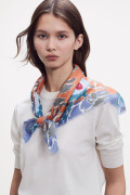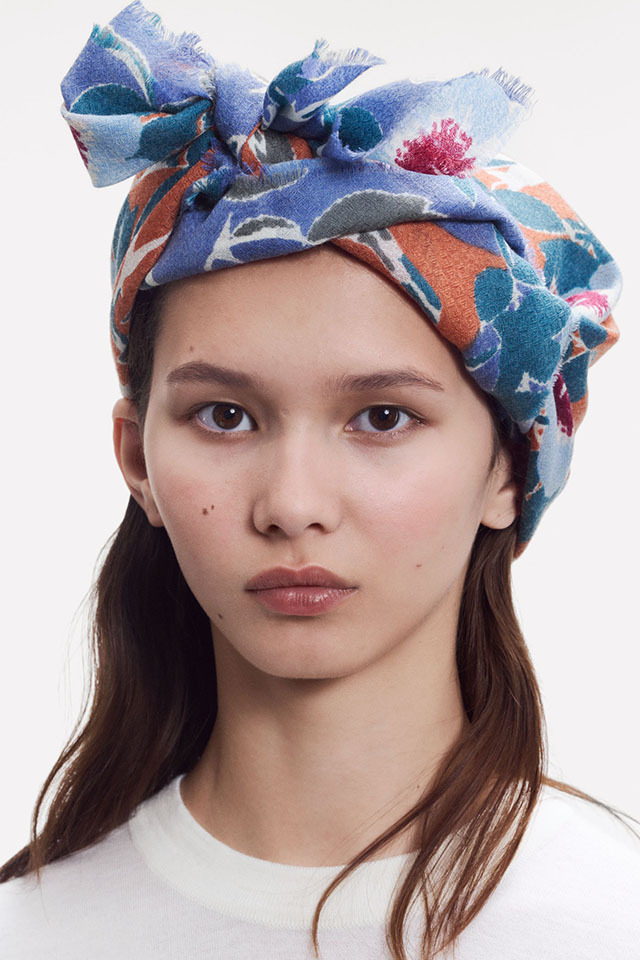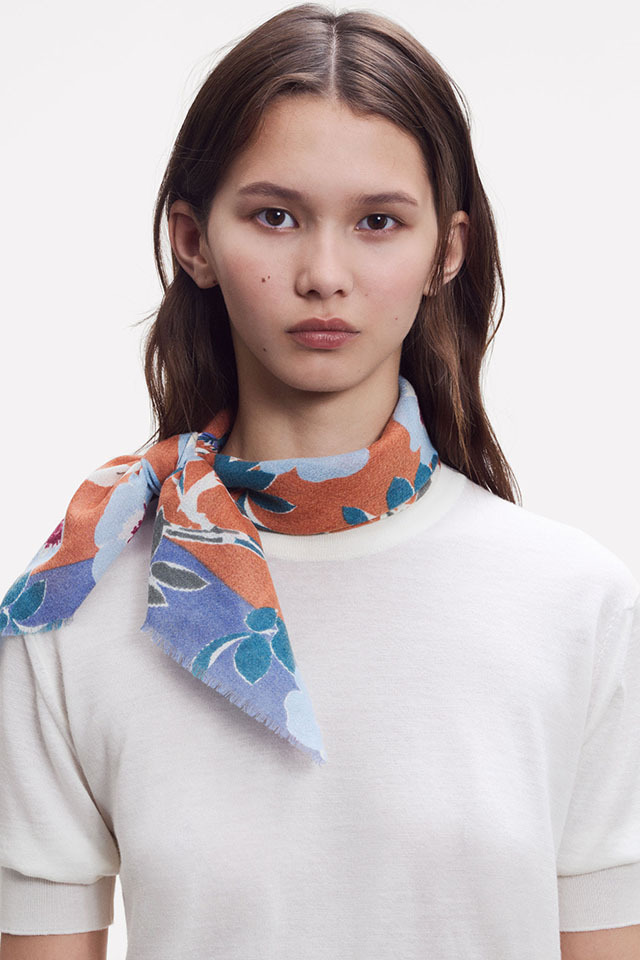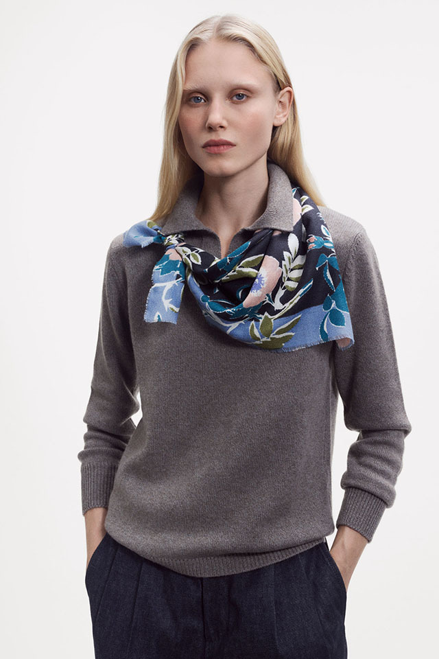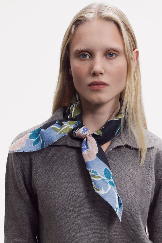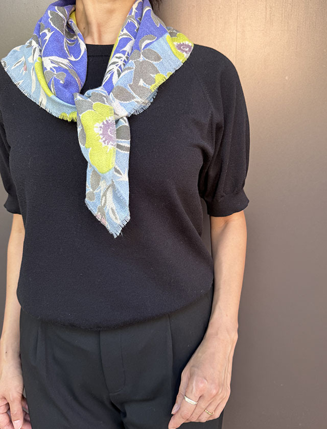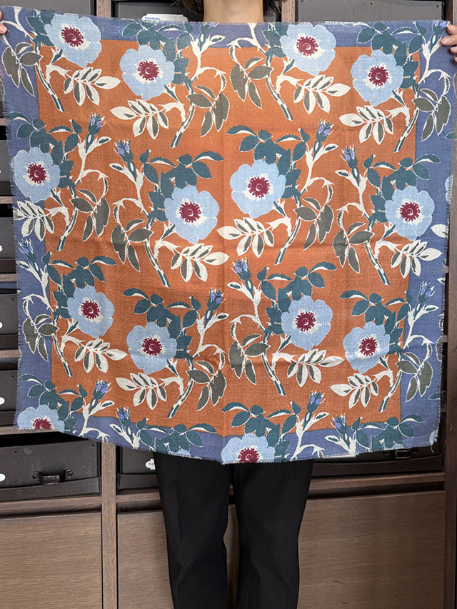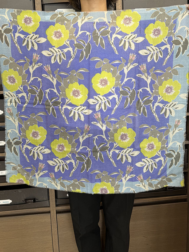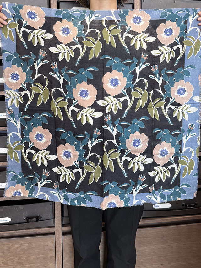 秋の訪れが早いコペンハーゲンに咲く≪北欧のワイルドローズ≫。 野生種のバラを描いたシンプルな筆致の花々は、力強い生命力に溢れ、縁のフレーム(額縁)効果からまるで《テキスタイルアート》のよう。レトロなムードがありながらも、時の流れに色褪せない新鮮な魅力を放っています。素材はウールにシルクとカシミヤがブレンドされ、しなやかな肌触りと、発色の良い上質感が際立ちます。
