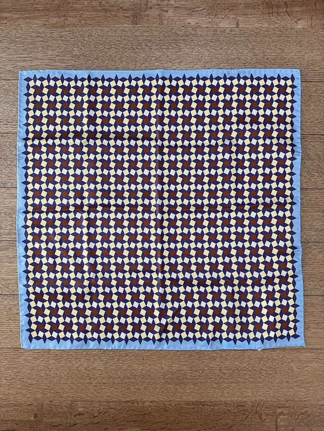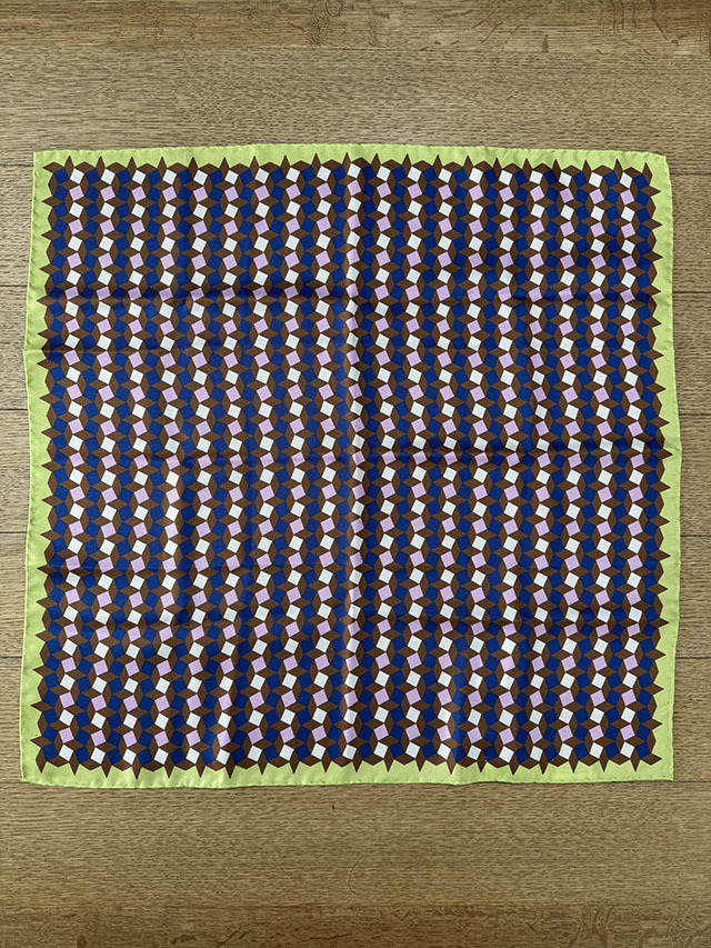 イタリアで丁寧に生産されたシルク100%のスカーフ。上質な光沢と美しい発色が魅力です。ペルシャ宮殿の装飾を思わせるリズミカルなタイル柄を、エピスならではのニュアンスカラーでモダンに表現しました。小ぶりながら洗練された存在感を放つ一枚です。