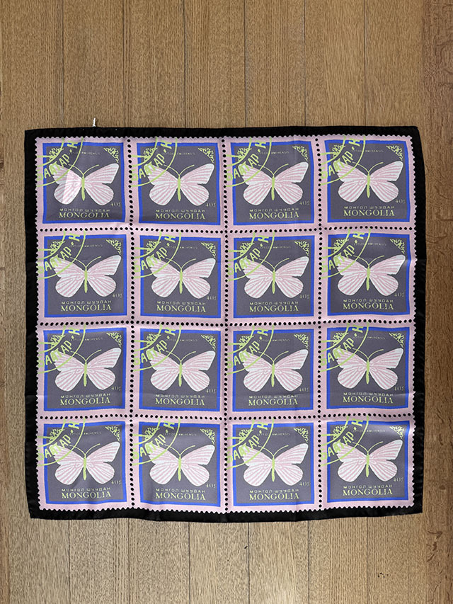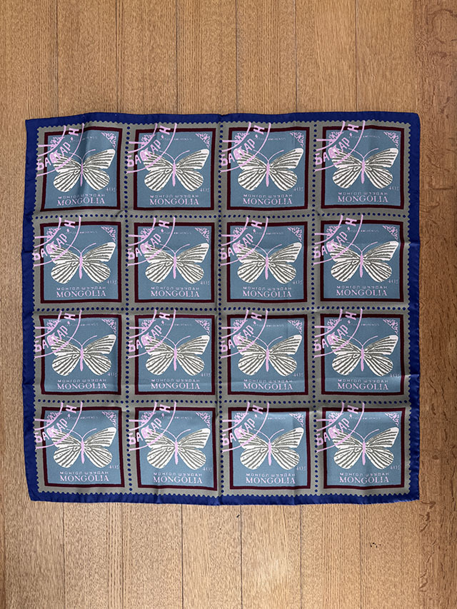 イタリアで丁寧に生産されたシルク100%のスカーフ。上質な光沢と鮮やかな発色が際立ちます。異世界へと舞い立つ蝶を描いた切手モチーフを、エピスならではのニュアンスカラーで大胆に表現。アート性の高い、印象的な一枚です。