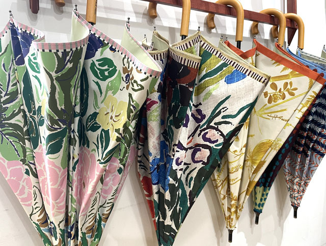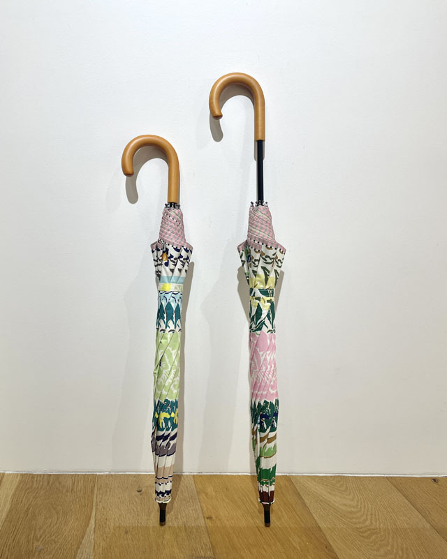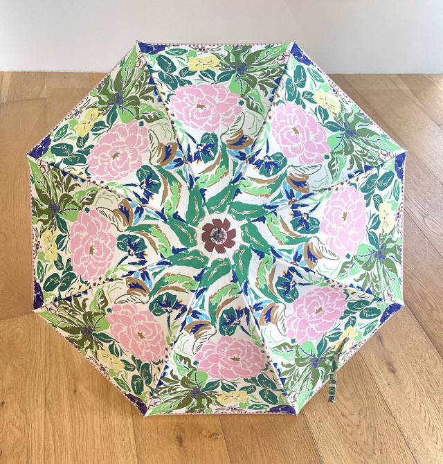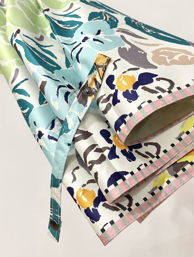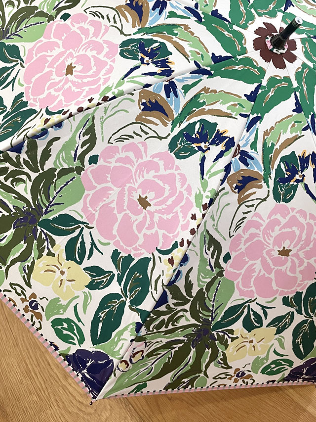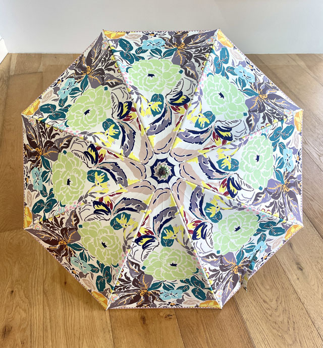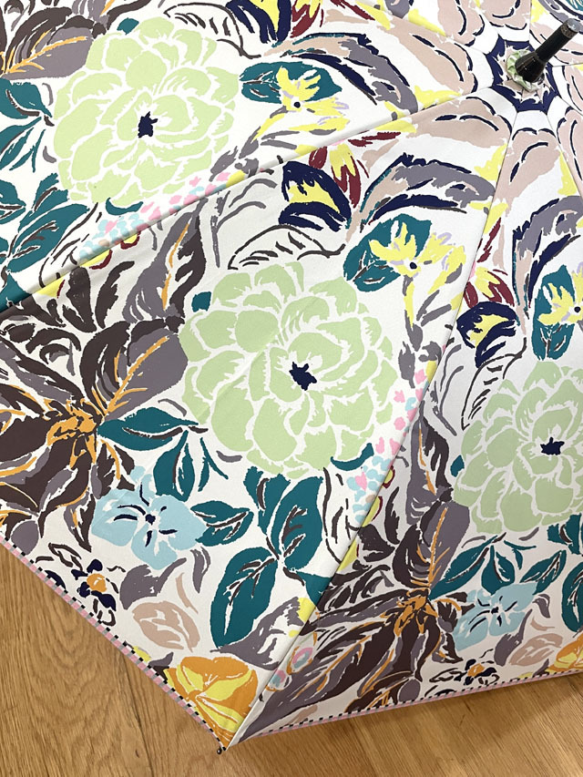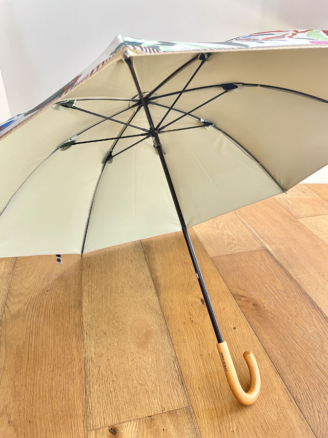 ストールのアーカイブ柄を傘用にアレンジしたプリント柄のパラソル。機能も充実の晴雨兼用の長傘タイプ。