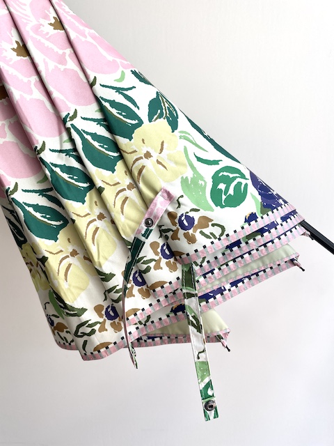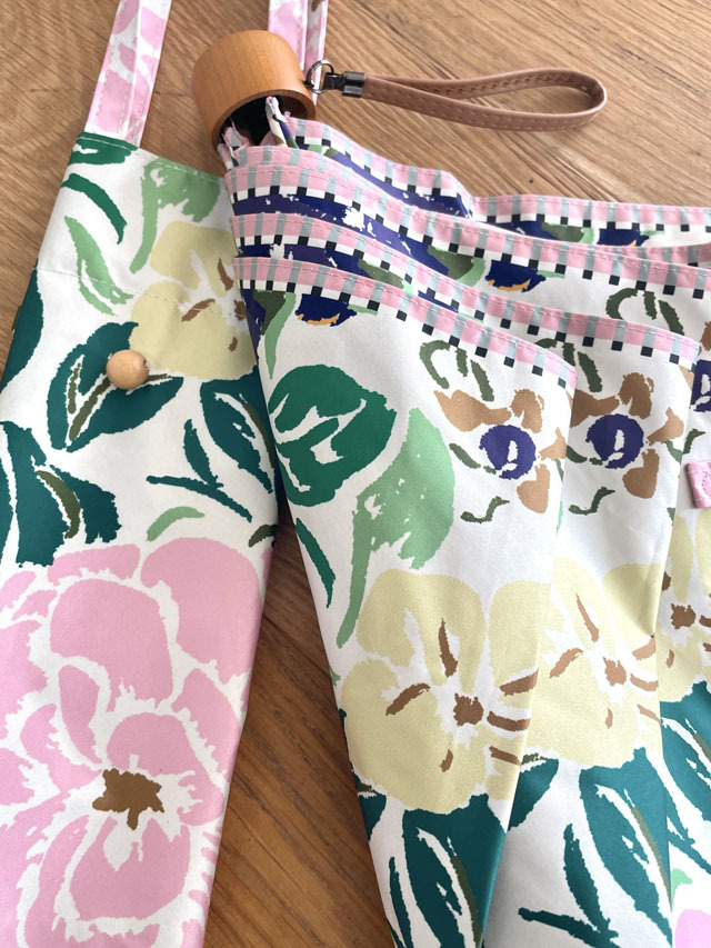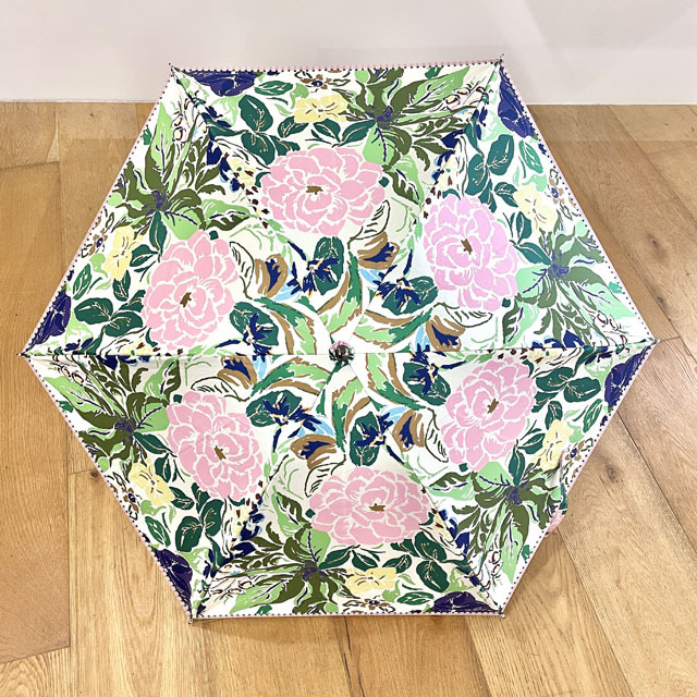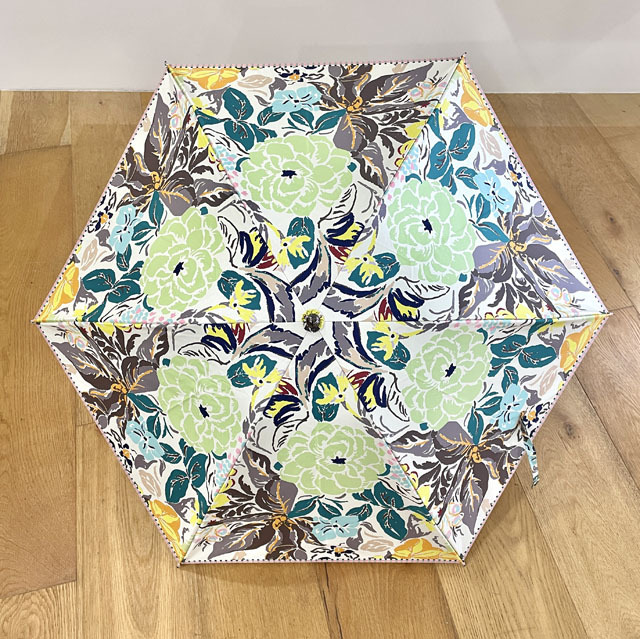 ストールのアーカイブ柄を傘用にアレンジしたプリント柄のパラソル。機能も充実の晴雨兼用の折りたたみミニ傘タイプ。