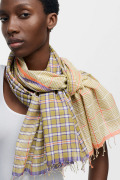 デザイナーが選び抜いた先染め糸をバランスよく配し、丁寧に織り上げたストールです。織りならではの奥行きと立体感が魅力。リネンコットン素材ながら、シャリ感を抑えたなめらかな表面とほのかな光沢が特徴、きれいめで洗練された印象に仕上がっています。