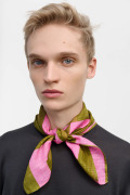 織りでさりげなくチェックを入れた、奥行きのある涼やかなテキスタイルは、軽やかでやわらかな着け心地。顔まわりにほどよいアクセントを添えます。シンプルな夏の装いに、さりげなく個性を添えてくれる一枚です。