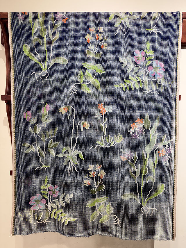 ネイビーとブラックの抑えた色調は刺繍の美しさを引き立て、甘さを抑えた大人の一枚に。ロングシーズン活躍する、素材の良さが際立つストールです。