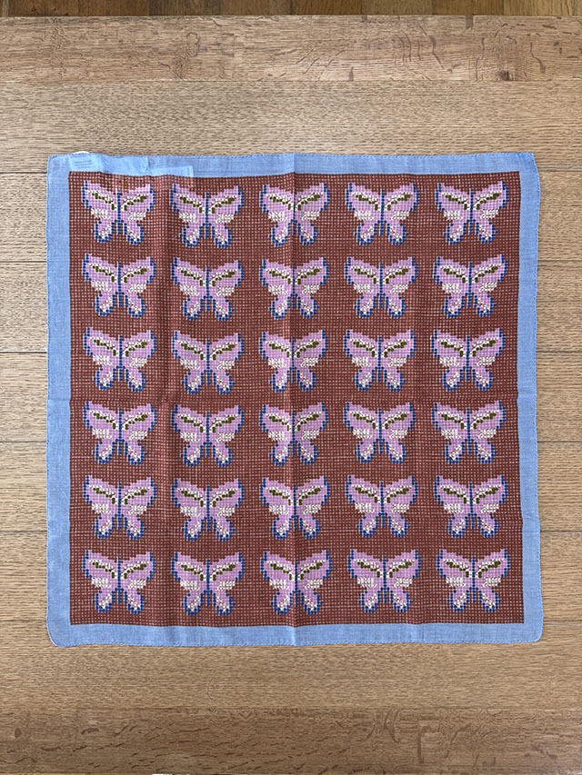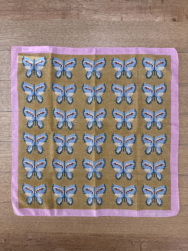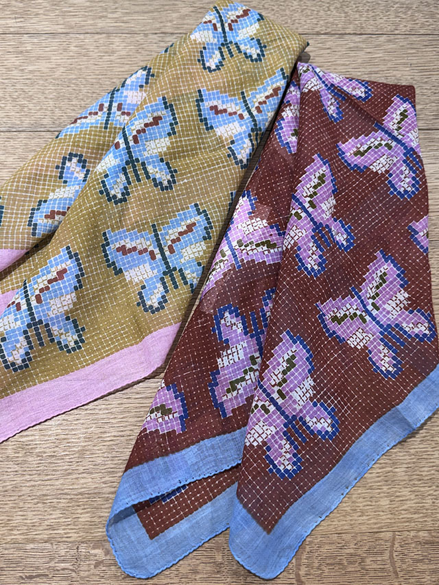 北欧寓話をテーマにした今季コレクションから、人気の「刺繍柄」が復刻しました。 スカンジナビアの伝統刺繍に着想を得て、布目を思わせる背景に蝶を一針ずつ刺したように描いたデザイン。ニュアンス豊かな配色が、やさしく幻想的な世界観を表現します。 上質な薄手コットン100%は、ほのかな光沢とさらりとした着け心地が魅力。 55cmスクエアは首元にすっきり収まり、ひと結びでバランスよくまとまる愛らしいサイズ。日よけや冷房対策にも活躍し、手洗いもできます。ギフトにもおすすめの一枚です。
