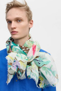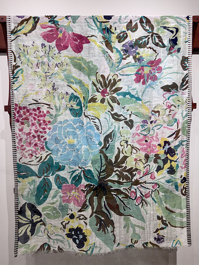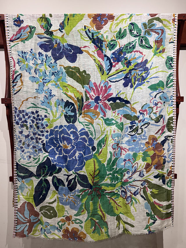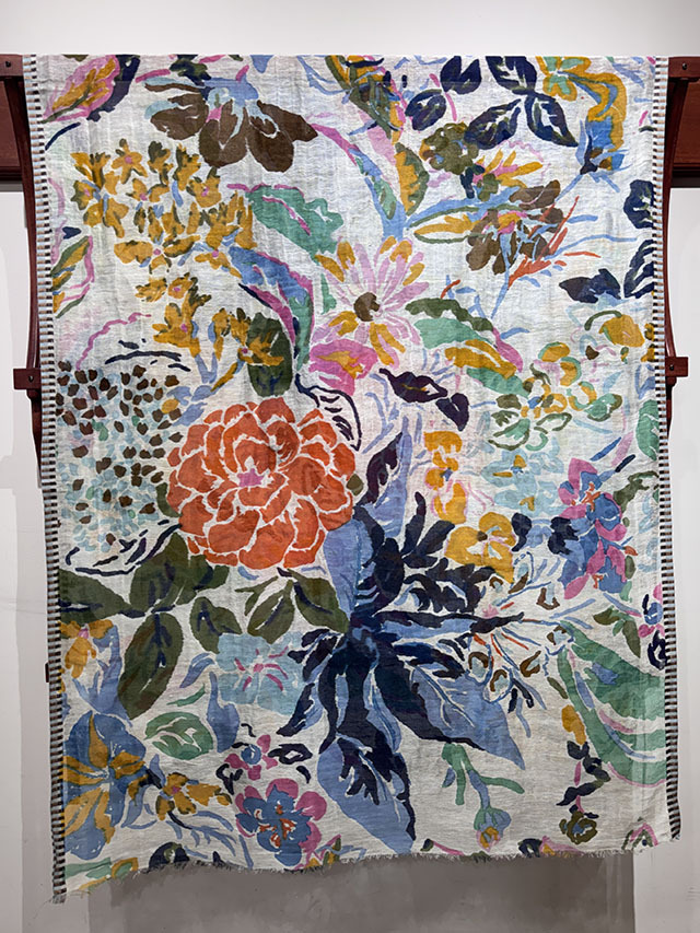 今季を象徴する花柄、「エピスフラワー」がデンマーク現代アートの画家 Tine Laulund(ティネ・ラウランド)のフローラル作品に着想を得て、瑞々しく復活しました。。大胆で華やかな構成に、セルベッジのジャカードボーダーがアクセントを添え、ロマンチックで洗練された雰囲気に仕上げています。
