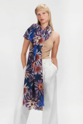 北欧の秋に咲く花を、パソコン上でグラフィック加工して、花びらの部分だけを残して単純化しました。「10月の花園」という名のこのストールは花びらの多色使いが華やかで印象的。 上品で深みのあるネイビー、艶やかなブラック、温もりとスパイスのバーガンディ、それぞれのベースの色とベストマッチの色が組み合わされています。