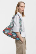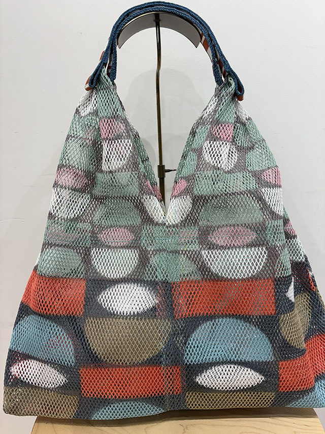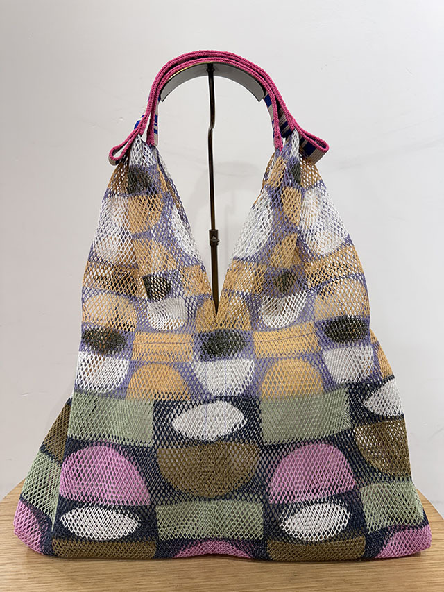 春夏に人気のメッシュバッグシリーズ。軽くて丈夫、おしゃれに持てるバッグです。取り外し可能な同布ポーチ付き。1960年代デンマークの名作テキスタイルに着想を得た幾何学グラフィック柄。円や四角をカットし重ねた構成と鮮やかな配色が魅力です。ボーダー柄の持ち手も印象的なアクセントに。