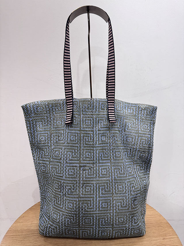地色をワントーンでまとめ、小さなラビリンス模様を繰り返した上品なパターン。ボーダー織りの持ち手がアクセントに。