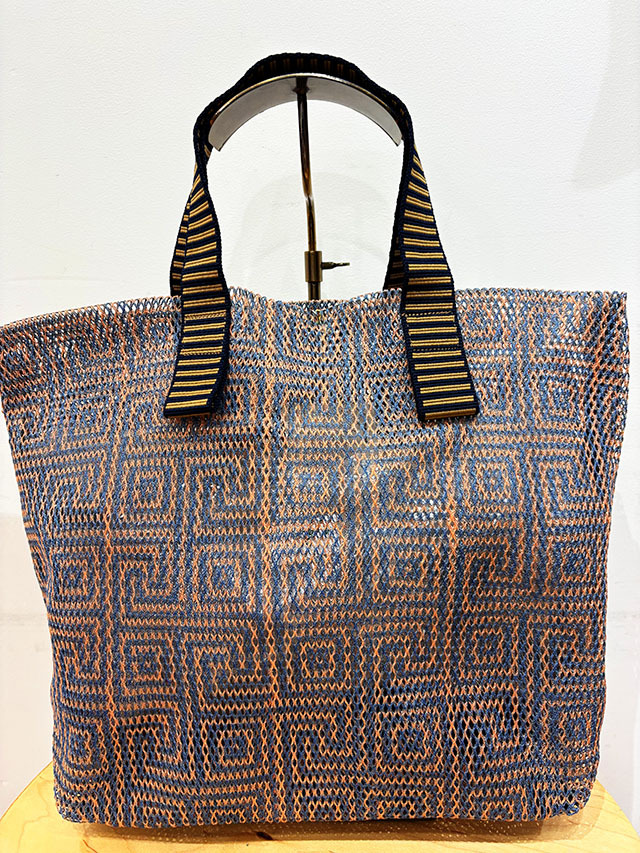 地色をワントーンでまとめ、小さなラビリンス模様を繰り返した上品なパターン。控えめな柄行きが大人っぽく、ボーダー織りの持ち手がアクセントに。2サイズ展開のトート型。こちらはコンパクトな小サイズで、タウンにもリゾートにも軽やかに活躍します。