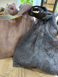 ワントーンの地色に小さなラビリンス模様を繰り返した上品なパターン。ボーダー織りの持ち手がアクセントに。