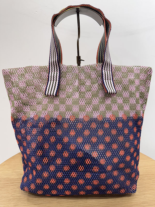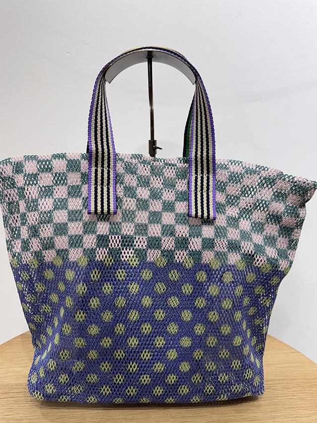 春夏に人気のメッシュバッグシリーズ。軽くて丈夫、取り外し可能な同布ポーチ付きです。円や四角を重ねた北欧グラフィックの《サークル&スクエア柄》。ニュアンス感のある色彩とボーダー織りの持ち手がアクセントに。
