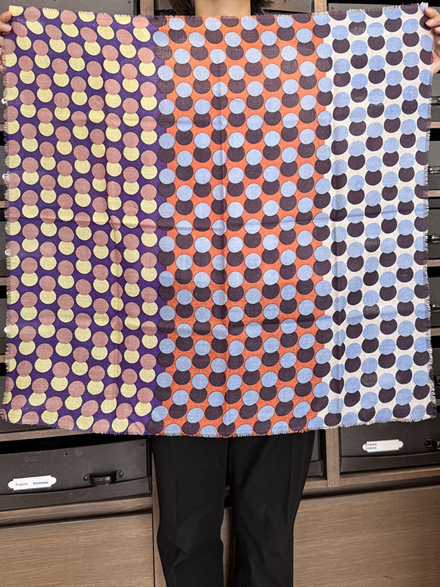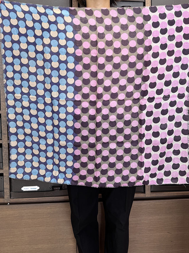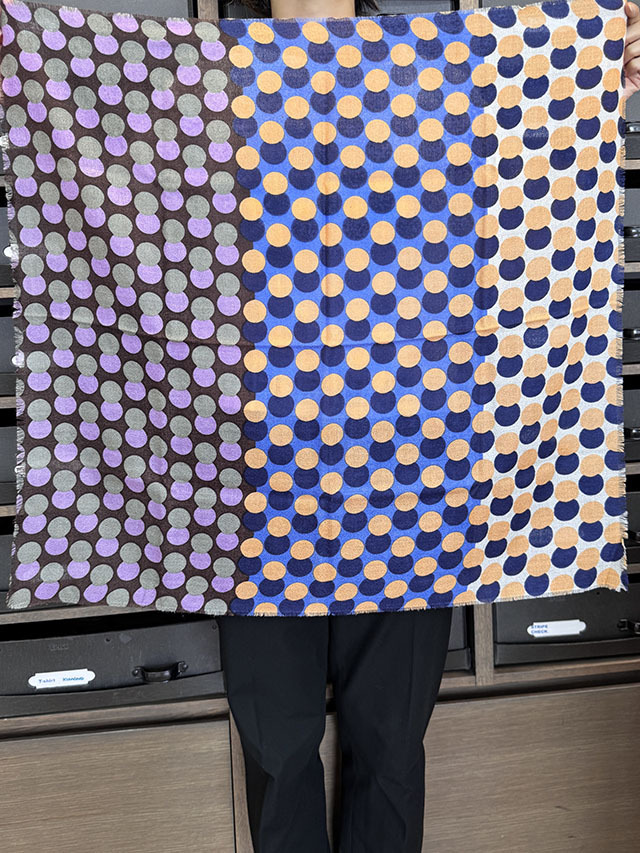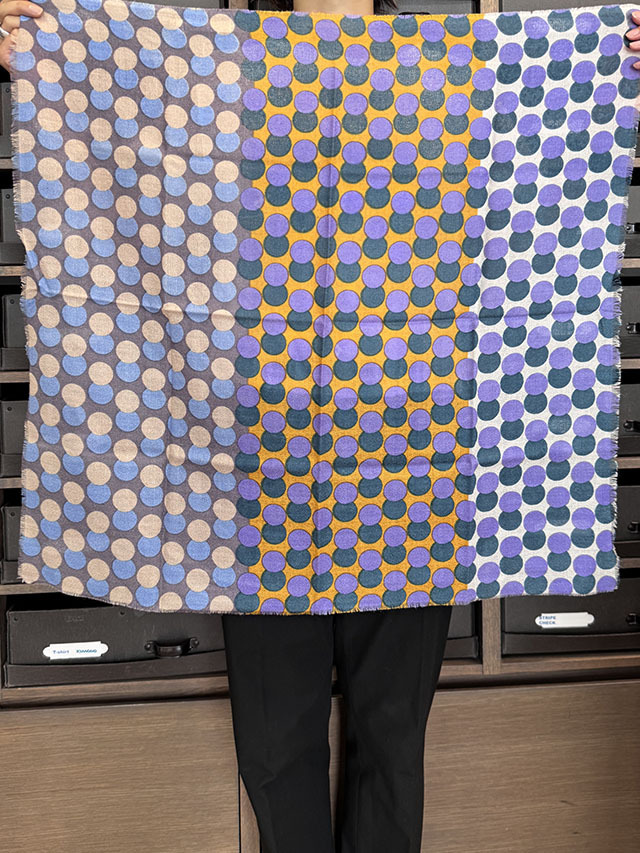 幾何学がモダンな今季の《グラフィック柄》。基本的な幾何学形状である円や四角のシェイプがカットされ、重ねられた《サークル&スクエア》シリーズのこちらは円の形。鮮やかな色彩の繊細な視覚効果で、ダイナミックな動きと奥行き感が感じられます。素材はウールにシルクとカシミヤがブレンドされ、しなやかな肌触りと、発色の良い上質感が際立ちます。