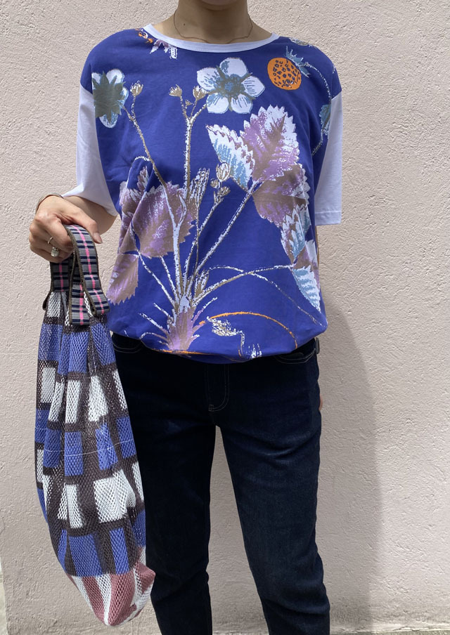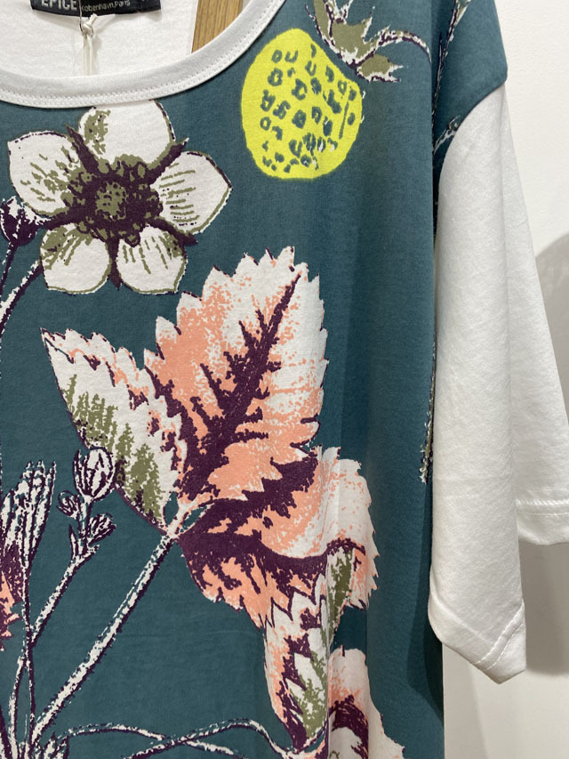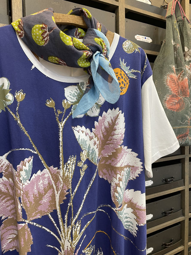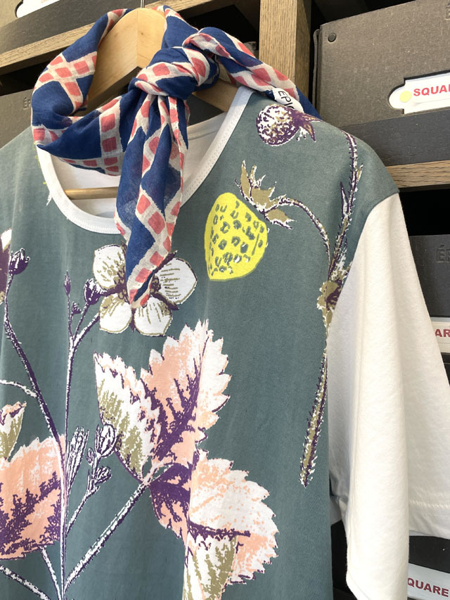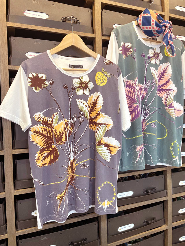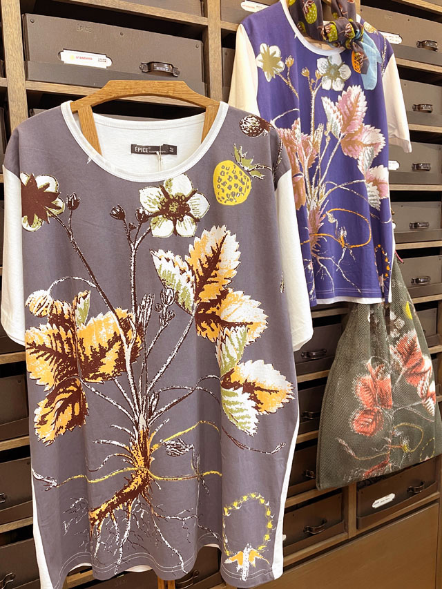 エピスの『Tシャツコレクション』は、肌触りの良い良質のコットン100%の生地に、エピスならではの色柄がハンドプリントされています。生地に適度な厚みがあるため、身体のシルエットがひびかず、1枚で着て様になります。柄は、『北欧の風薫る季節―豊かな森の木の果実』から、木苺の柄。古い植物図鑑風なタッチで、森に自生する木になる果実の美しい形状、枝葉の力強さが新鮮です。