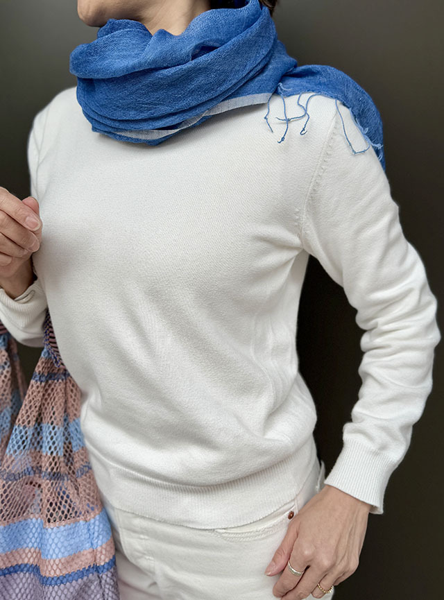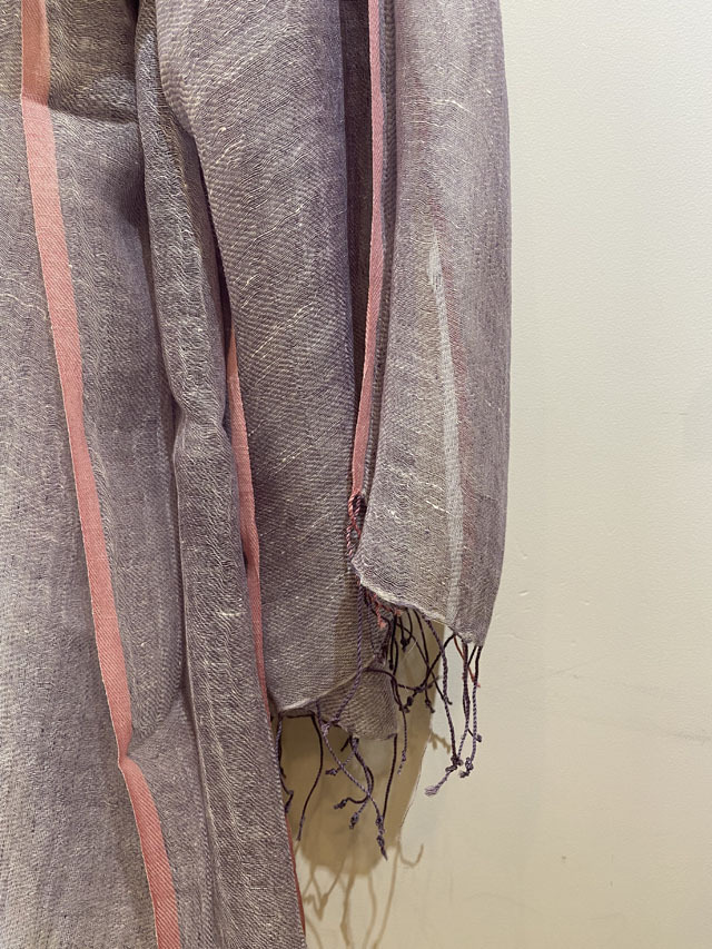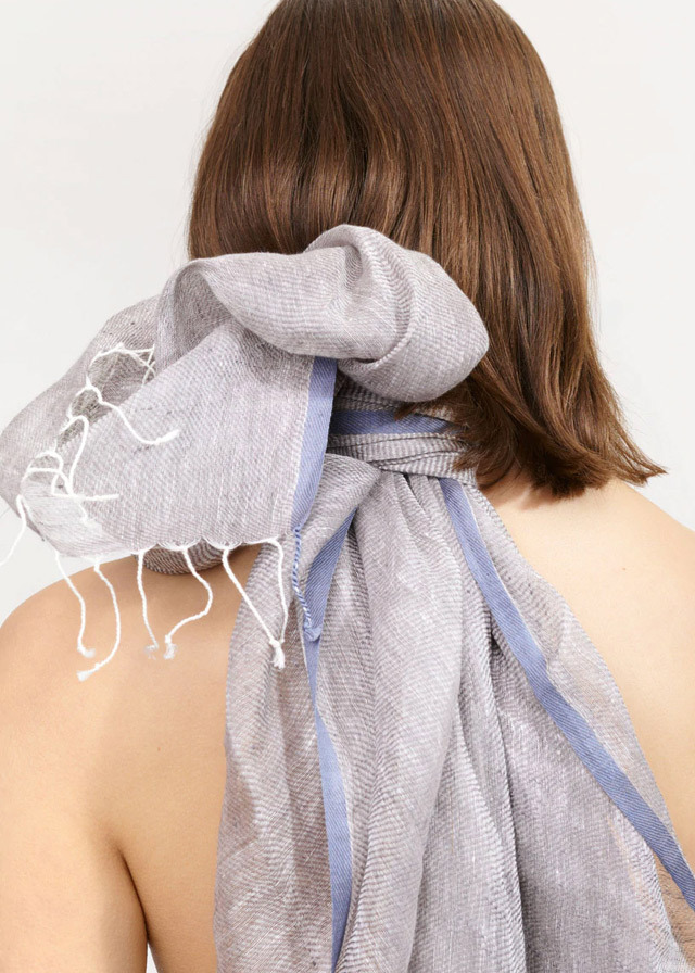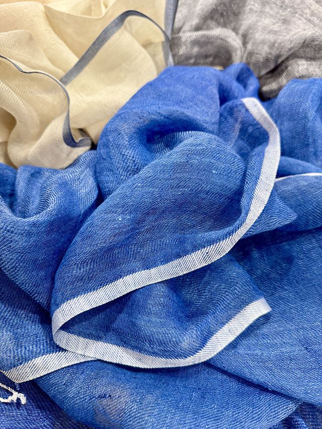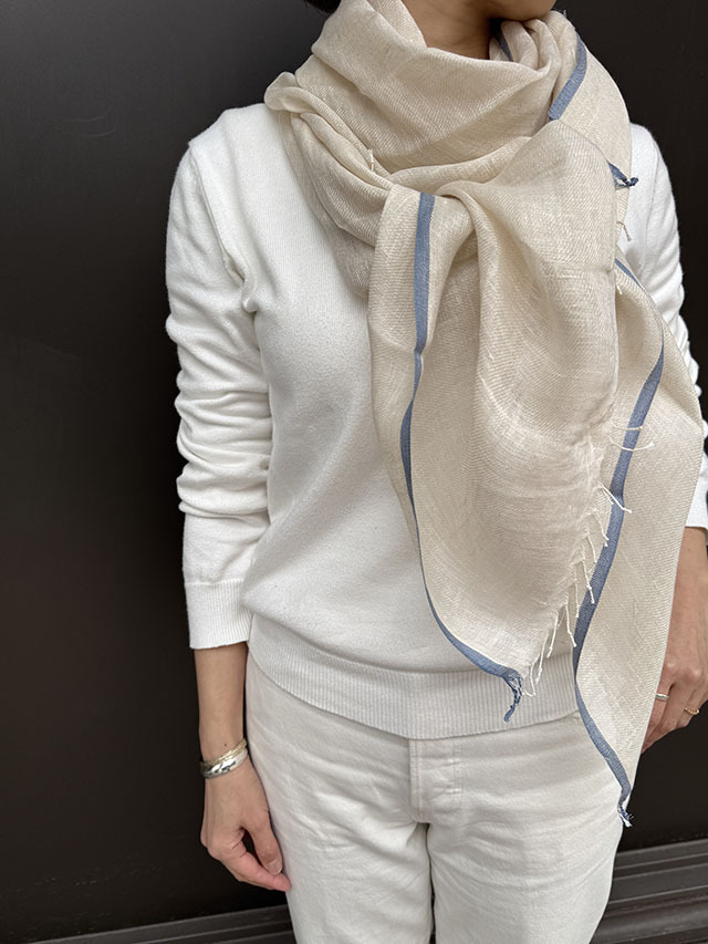 エピス春夏定番の『無地ストール』。素材は上質な麻100%、贅沢なサイズ感が、巻いた時にはほどよいボリューム感と美しいドレープを作り、華やかさを演出します。「先染め」した異なる2色の糸を織っているため、奥行き感のあるシャンブレー風の色合いが魅力です。糸の一色に白が使われることが多く、淡色との組合せだと軽くて涼しげな風合いになり、濃色だと重くなりすぎない抜け感のある印象になるのが特徴です。